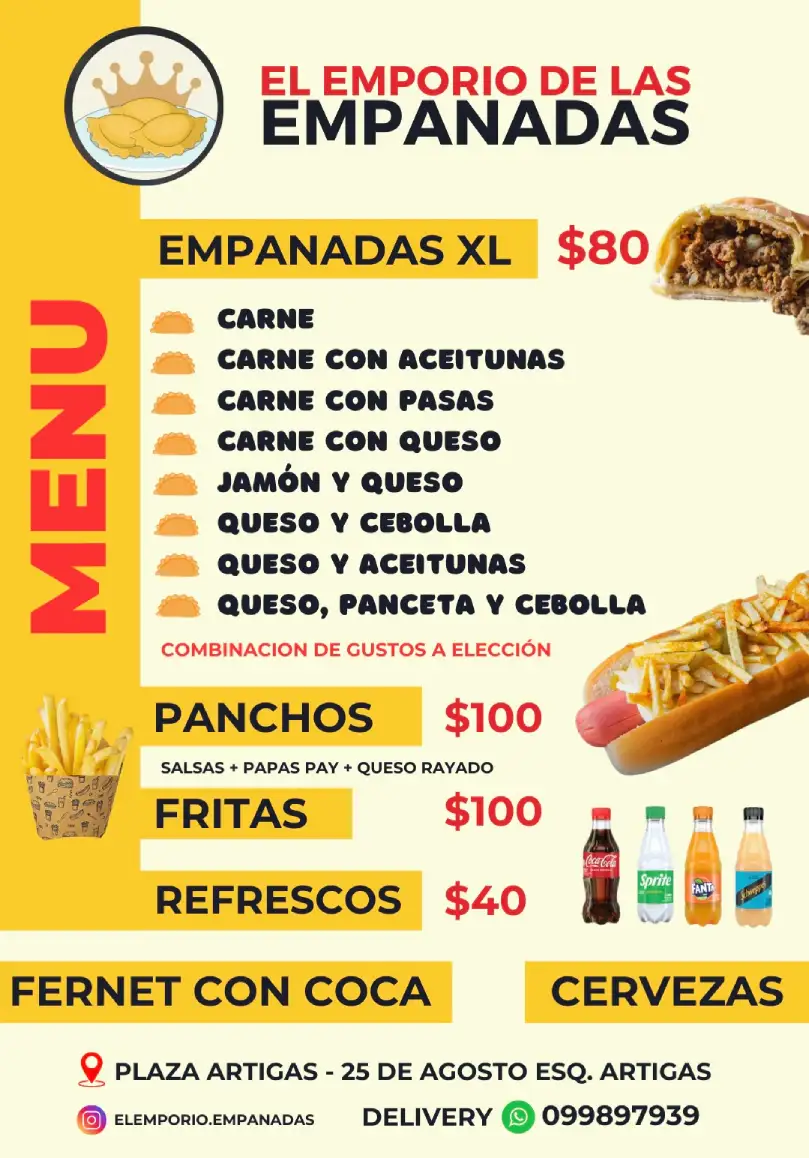Uncategorized El Emporio Empanadas Abierto todos los días de 19:00 a 00:00 hrsContamos con Envíos.Dirección: 25 de Agosto esq. Artigas Chat en WhatsApp MENU FOTOS: UBICACIÓN: