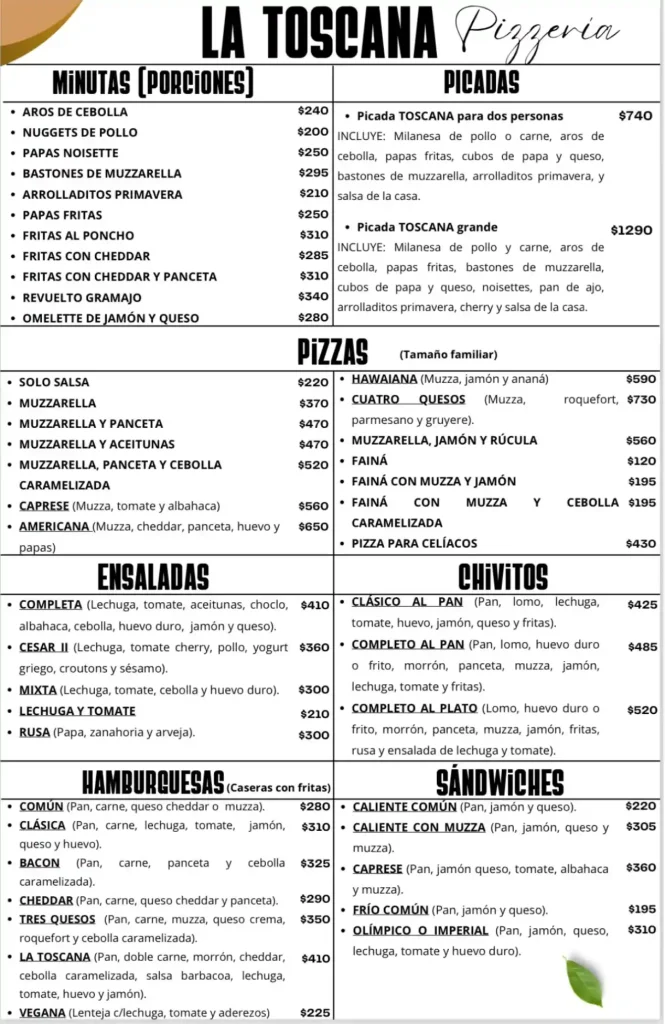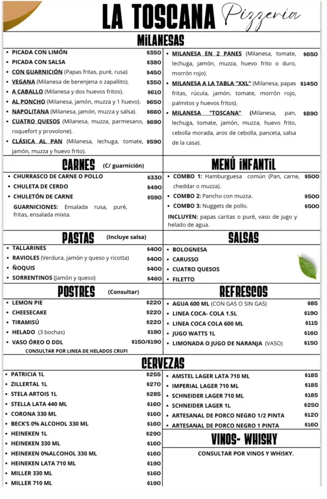 Pizzerías La Toscana Pizzería La Toscana Pizzería Salto Horario: Martes a Domingos a partir de las 20:00 hrsDelivery Sin costo. Chat en WhatsApp CARTA PROMOS PLATOS TRAGOS SALÓN Ubicación